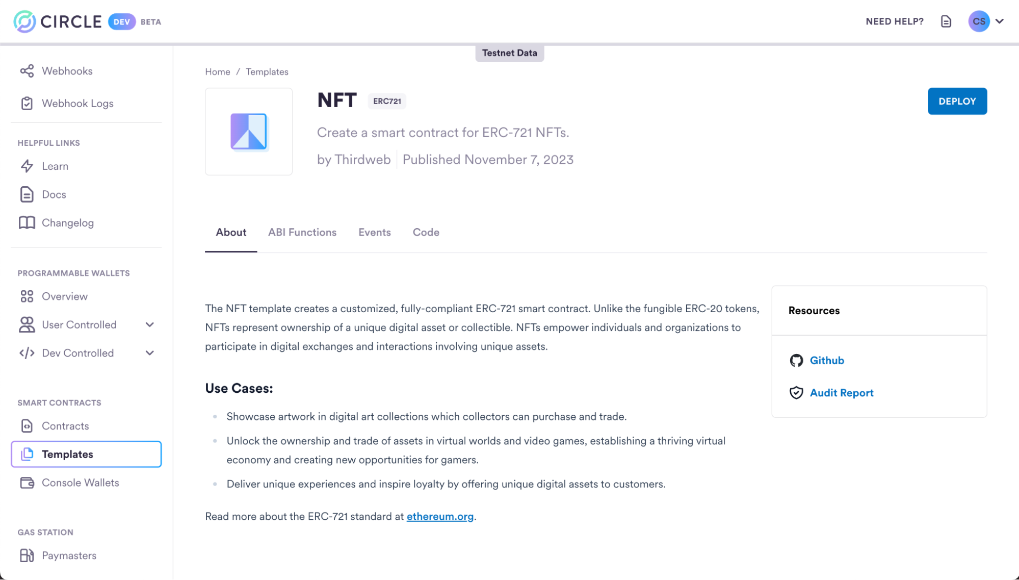 This guide will show you how to deploy an ERC-721 contract using Circle’s NFT template. Yo’ll learn to use both the Developer Services Console and API paths. The console is ideal for beginners to explore and understand contract functions.Evaluate Templates