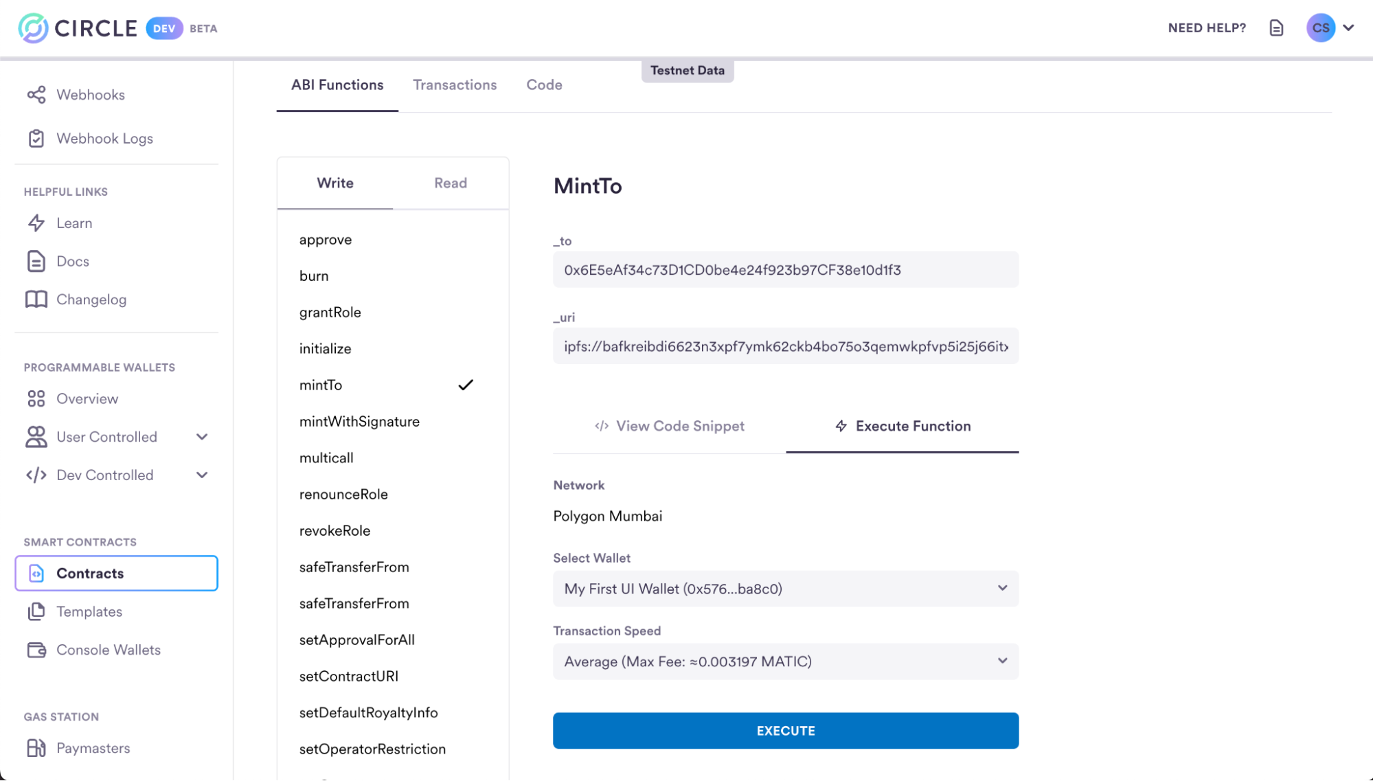 - Select Execute Function and ensure Console Wallet 1 is selected.