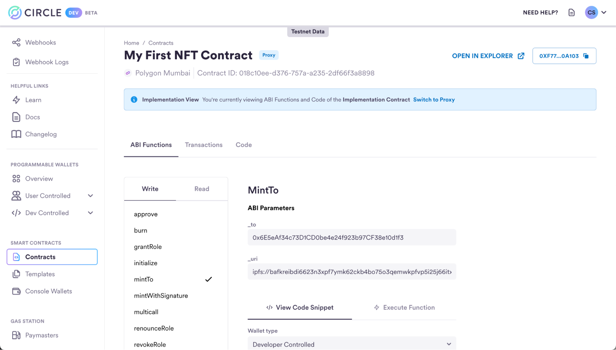 Let’s dive into the Developer Services Console to explore its full range of capabilities. With the Console, you can seamlessly explore the NFT contract you deployed. Gain insights into its ABI functions, inspect their inputs, and easily execute functions through an API call by conveniently copying the required code. Alternatively, you can retrieve detailed information about the contract using theGet contract by ID
