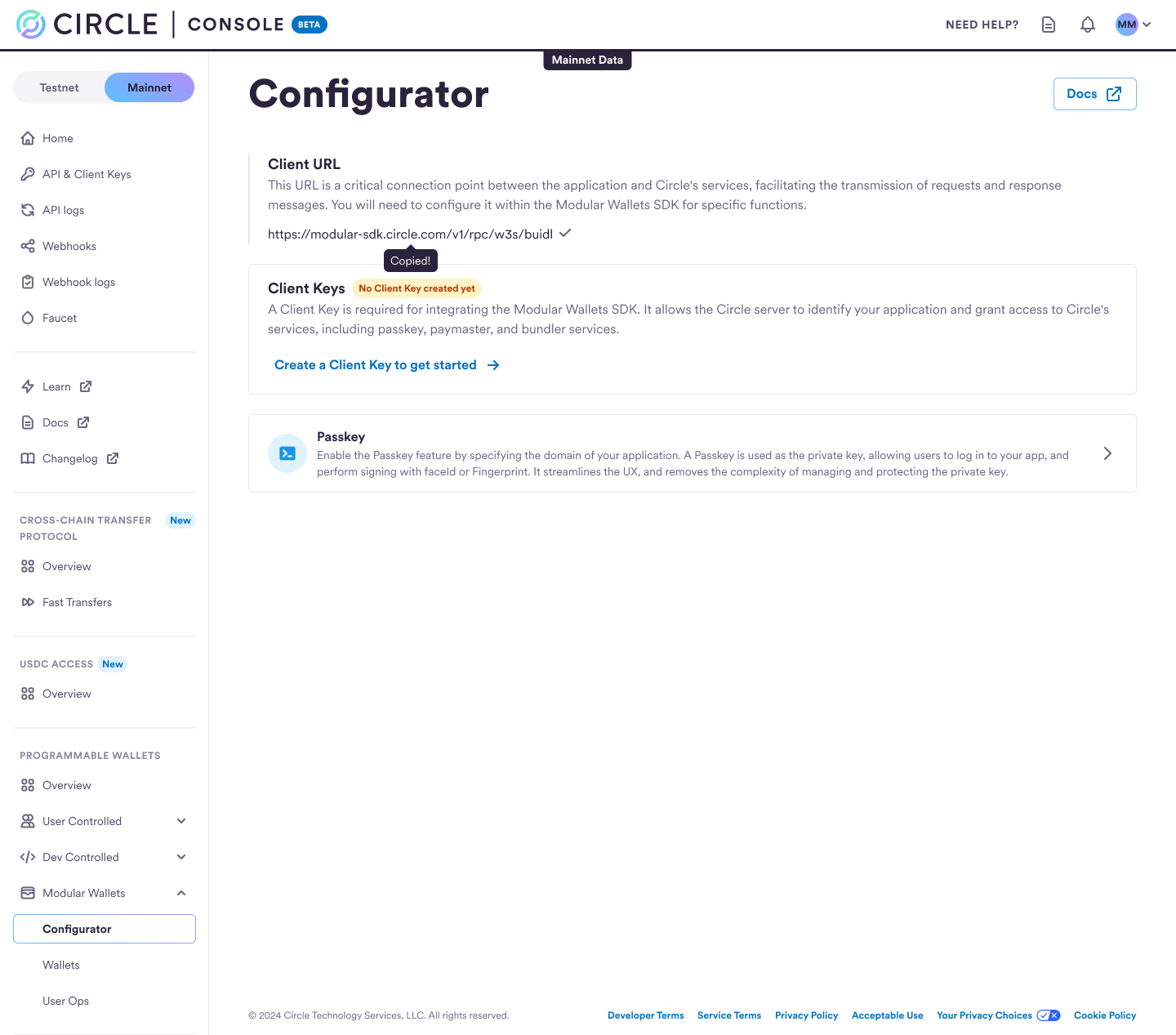 Visit the Configurator page to retrieve the Client URL, or copy from here:https://modular-sdk.circle.com/v1/rpc/w3s/buidl. This URL is required for the