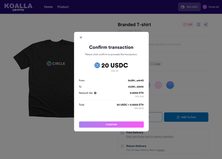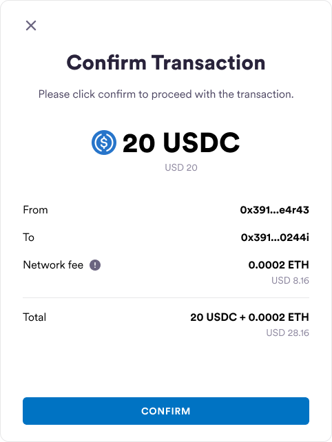 These confirmation UIs are predefined by Circle. The following example shows the UI for confirming an outbound transfer on the web app: