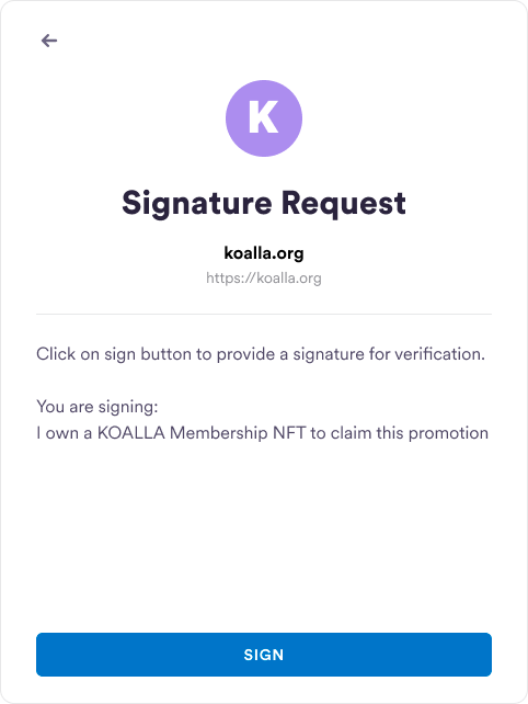 | Description | Click on sign button to provide a signature for verification You are signing: I own a KOALLA Membership NFT to claim this promotion | Text, color, size, font |