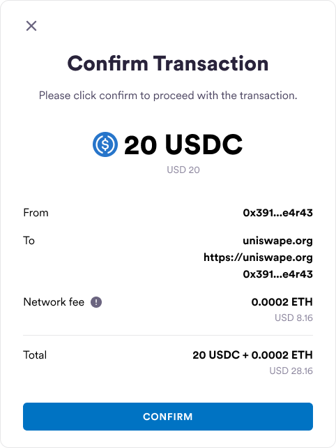 For detailed instructions on customizing UIs for web, iOS, and Android, see the following docs: Below are examples of customizations for confirmation UIs for an outbound transfer, contract execution, and sign message or typed data:Outbound Transfer
