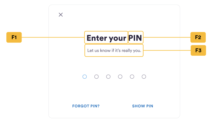 | E1 | headline | Headline text Keep the placeholder like this: E.g. `Re-enter your {{pin}} to confirm` |
