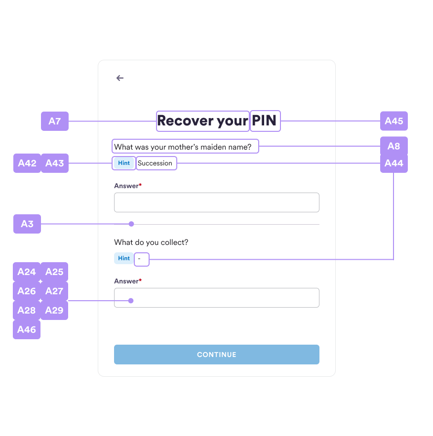 | A43 | recoverPinHintTitleBg | Background color for recover pincode hint title, e.g. ‘#FFFFFF’ or ‘white’. |