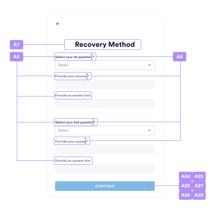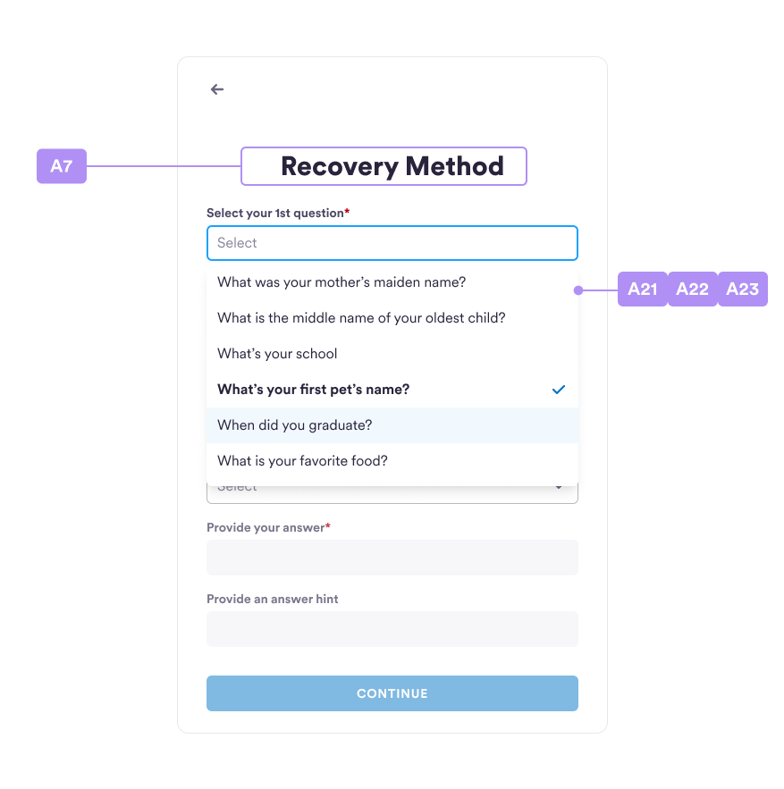 | B2 | setCustomSecurityQuestions( questions?: SecurityQuestion[] | null, requiredCount = 2, securityConfirmItems?: string[]) | Set the required count of security questions. The value is 2 by default. |