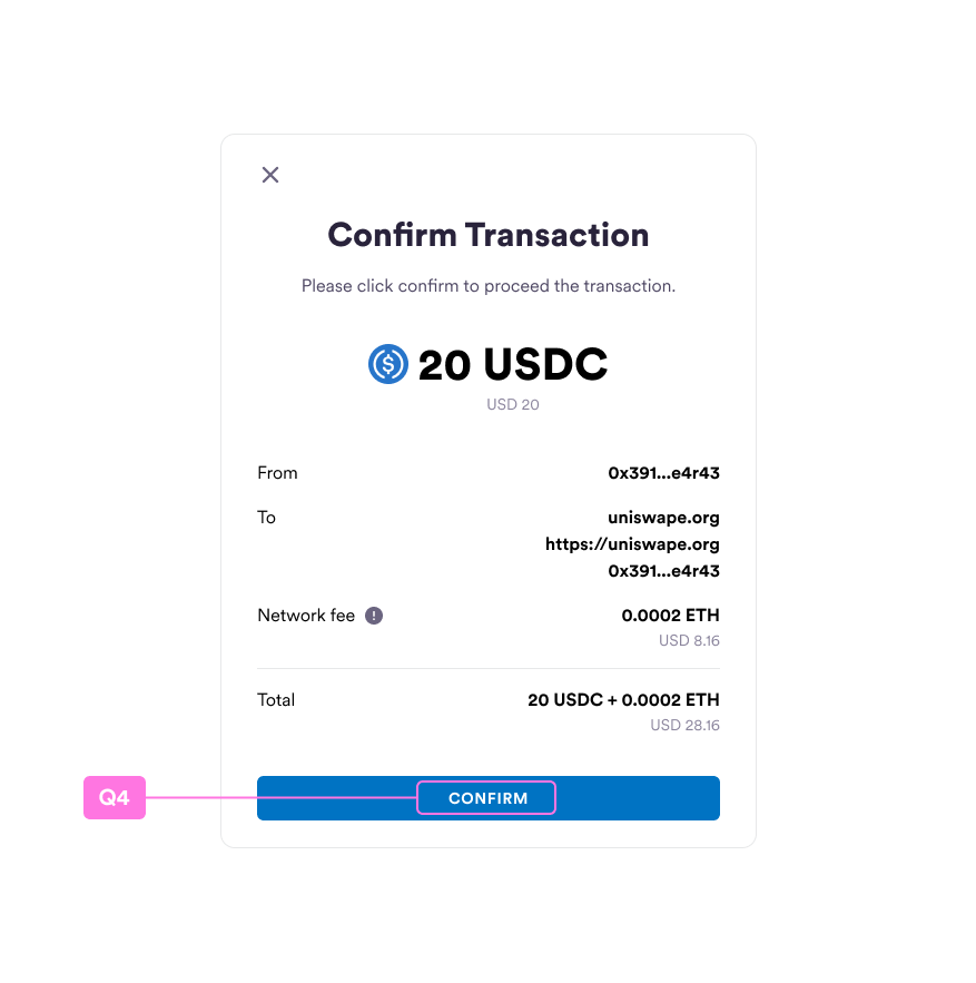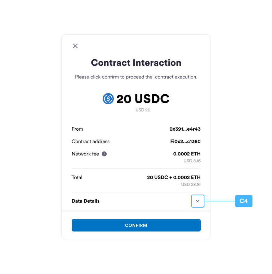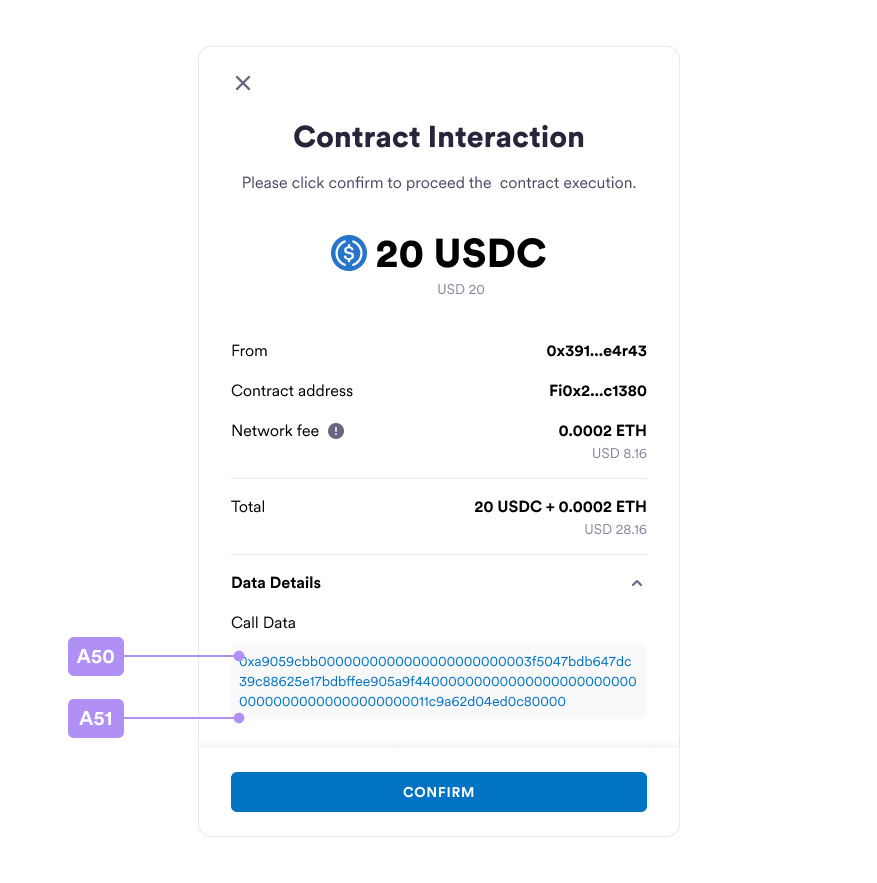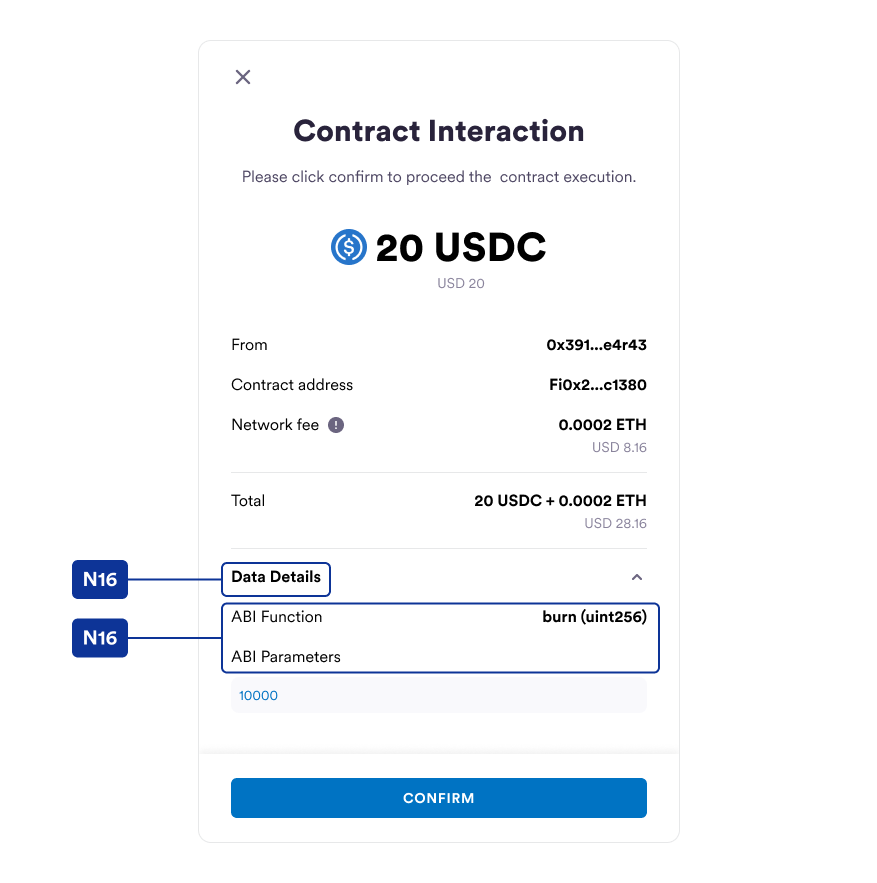 | N16 | dataDetails | An object for contract interaction data detail display. { dataDetails?: { dataDetailsLabel?: string callData?: { callDataLabel?: string data?: string } abiInfo?: { functionNameLabel?: string functionName?: string parametersLabel?: string parameters?: string[] } } dataDetailsLabel: data details label callData or abiInfo: The use could choose either one to fill up depending on the transaction can be parsed by abi (choose abiInfo) or not (choose callData) |